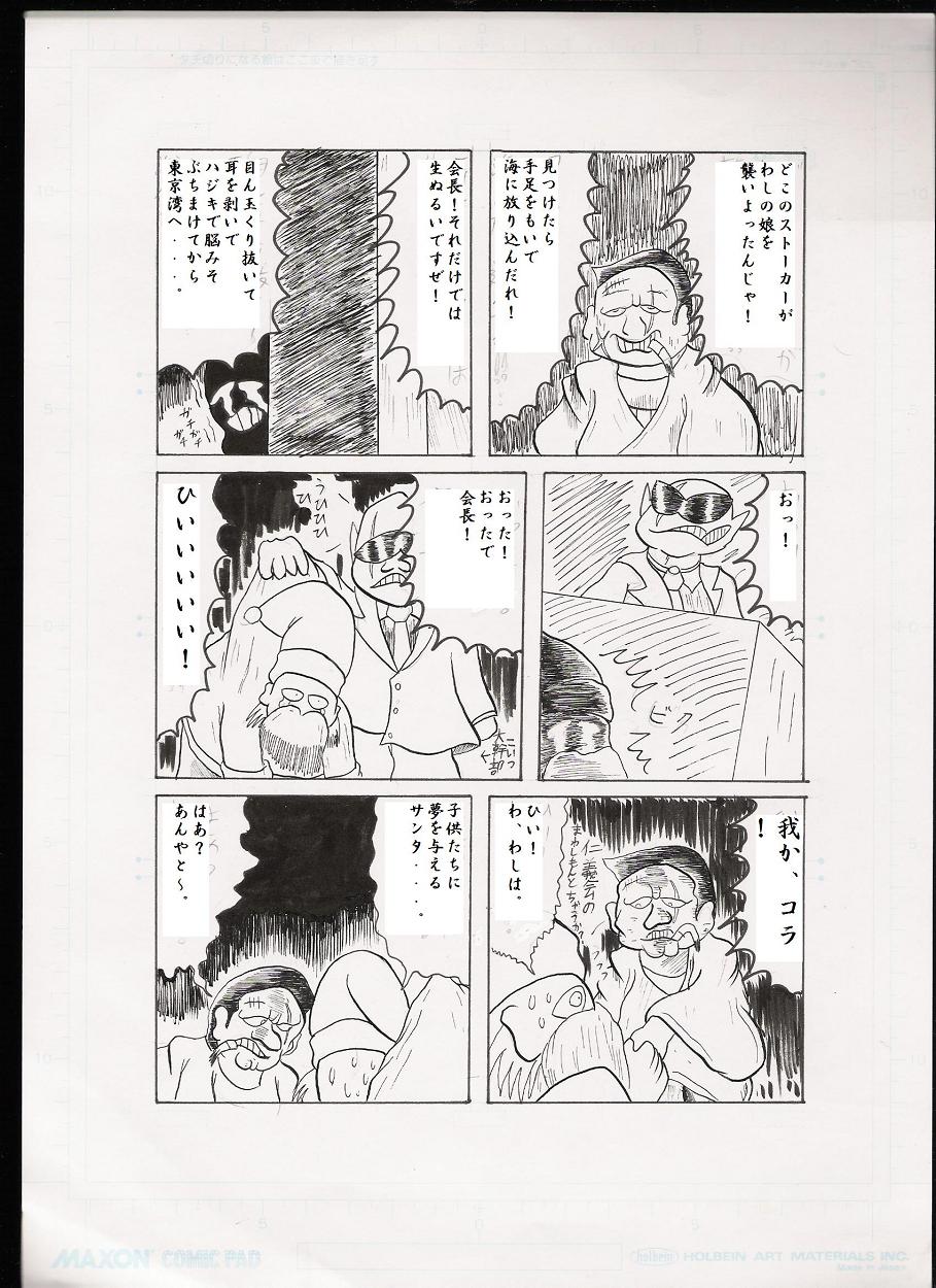 原稿の裏に制作日平成10年8月14日と ありましたが何が目的で描いた漫画かは 全然覚えがありません。ネット上で流すか どうしようか迷ったのですが結局流す事に しました。